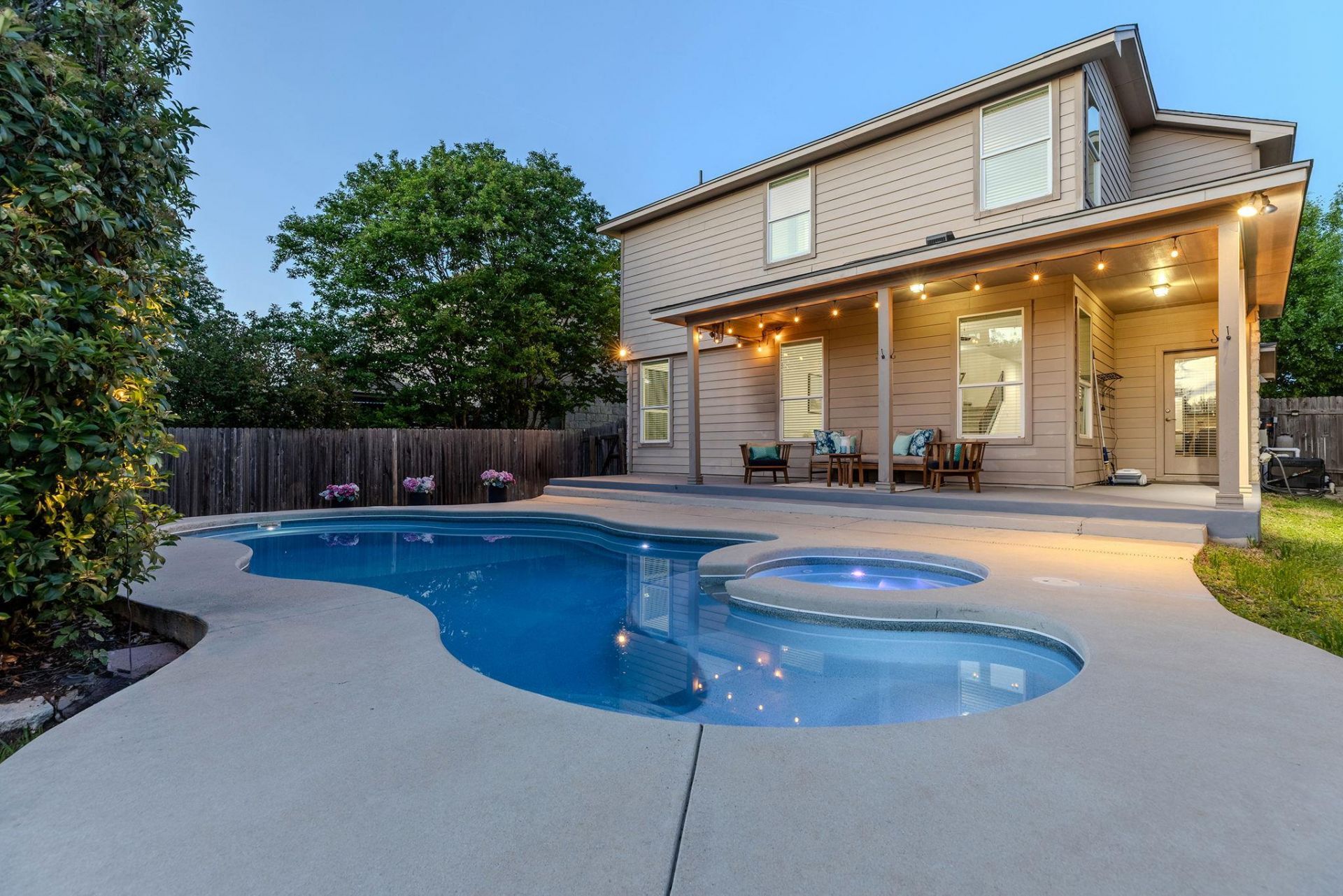Step into comfort and functionality in this beautiful 5-bedroom, 3-bath home featuring a private pool and hot tub, designed for everyday living and effortless entertaining.Just off the entry, a dedicated office overlooks the front yard, offering a peaceful space to work from home. As you move further in, the heart of the home unfolds. The kitchen features rich espresso cabinetry, granite countertops, and an island perfect for gathering. A cozy breakfast area catches the morning light, while the open layout flows seamlessly into the spacious living room. Hardwood floors run through the entry and living areas, with tile in the kitchen and dining for easy everyday living.The main floor also includes a guest bedroom and full bath, along with a conveniently located laundry room.Upstairs, a generous loft offers flexible space for a game room, second living area, or workspace. Three additional bedrooms and a full bath with dual sinks provide room for everyone. Through French doors, the primary suite offers a private retreat with dual vanities, soaking tub, separate shower, and an oversized walk-in closet.The true highlight awaits outside.Step into your own private backyard oasis, designed for year-round enjoyment. The covered patio sets the stage for relaxed mornings and shaded afternoons, while the heated in-ground pool and spa invite you to unwind in every season. From summer pool days to evenings under the glow of string lights, this space was made for gathering, entertaining, and making lasting memories.Located in desirable Avery Ranch West, residents enjoy resort-style pools, hike-and-bike trails, tennis and pickleball courts, parks, playgrounds, and community events. Conveniently located near major employers, shopping, and dining, this home offers comfort, convenience, and lifestyle all in one.